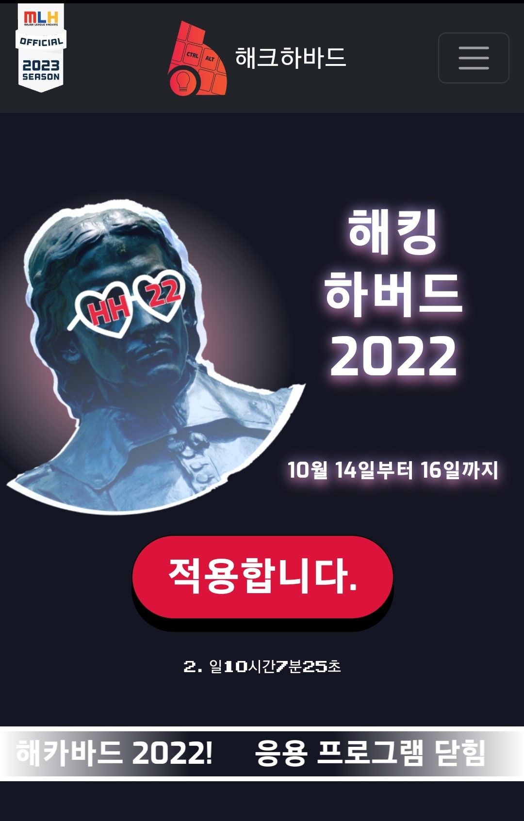 위 주소로 들어가 보시면, 각 대학교에서 하는 해커톤 대회에 대한 소개 및 참가신청을 할 수 있도록 꾸며놓은 앱입니다. 그럼 하버드 대학교 해커톤 대회부터 알아보도록 하겠습니다.