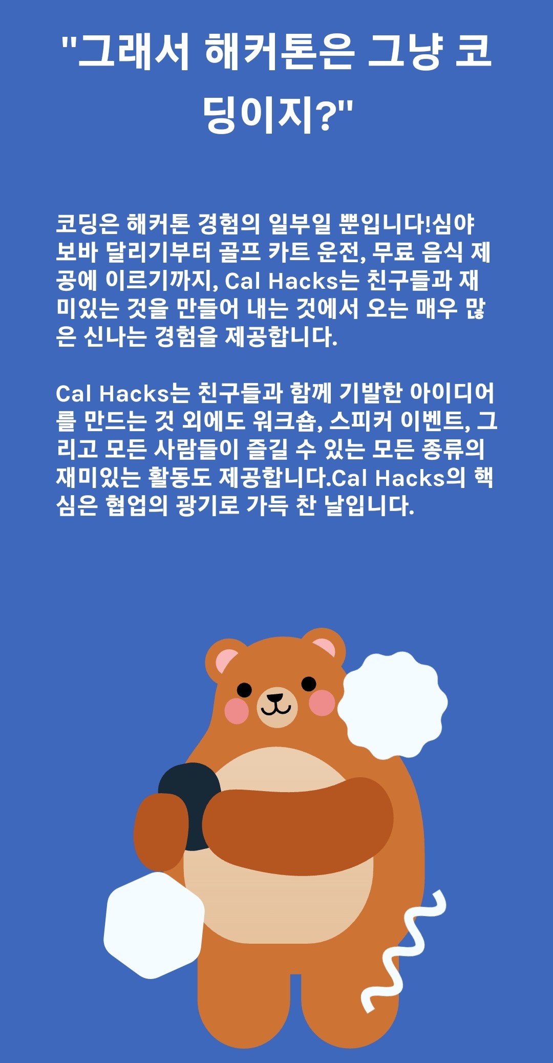 Cal Hacks is the world's largest collegiate hackathon hosted at UC Berkeley, fostering a culture of hacking, entrepreneurship, and social good via the empowerment of technology.