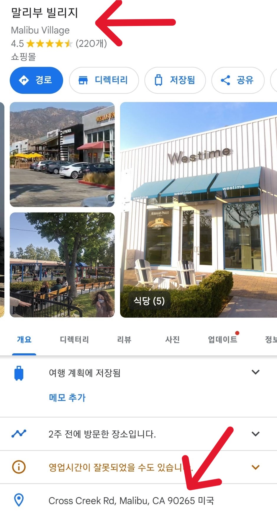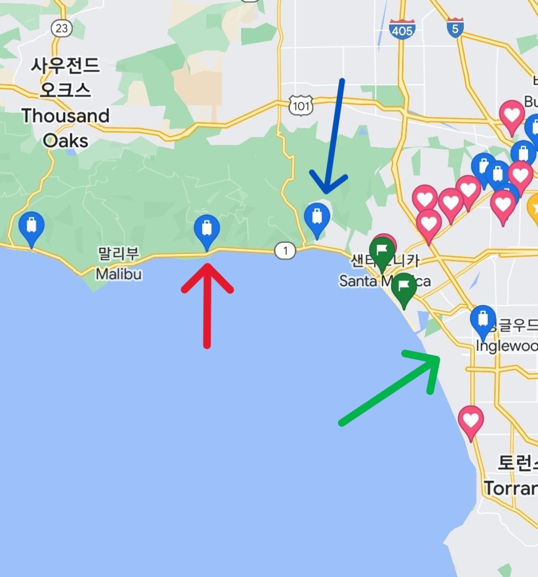 빨간 화살표 : 말리부 방문 포인트